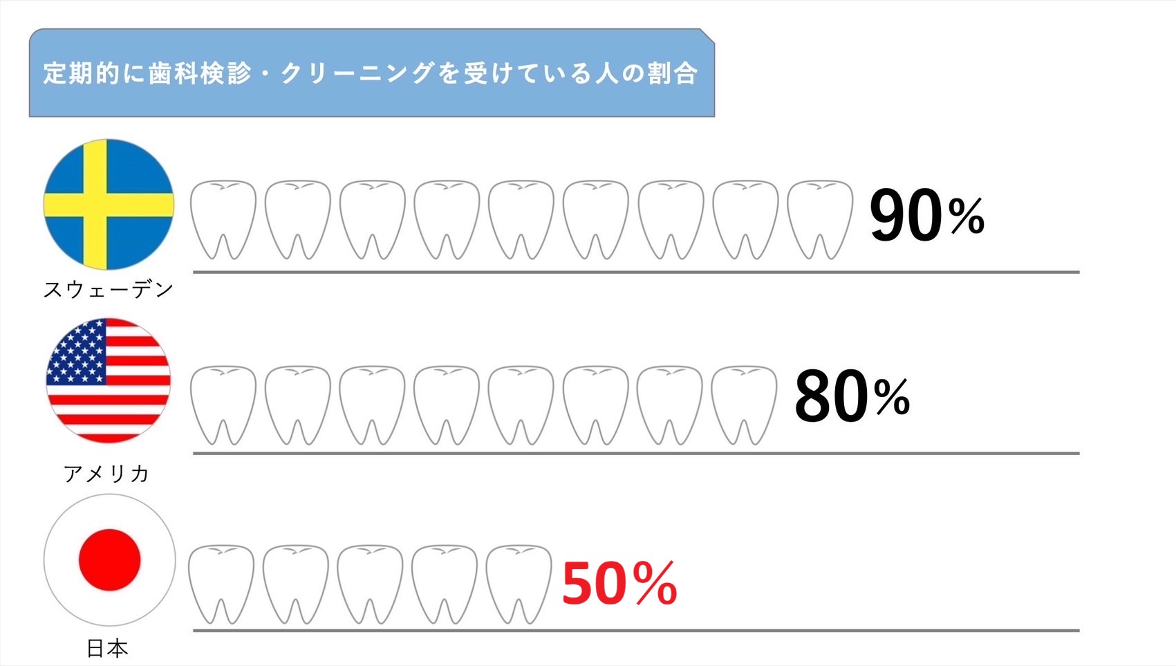 歯科治療や予防の先進国であるスウェーデンでは、国民の80%以上が8020を達成しており、アメリカでも80歳の歯の数は平均17本とされています。世界でもトップレベルの長寿国である日本は、80歳の歯の数がかなり少ない状態ですが、これには歯科検診受診率の低さが大きく影響していると考えられています。 スウェーデンでは子どもの歯科定期検診受診率は100%であり、成人でも80%以上が定期的な歯科検診を受診しています。欧米では平均して70%以上が歯科検診を受けているとされていますが、日本では定期的な歯科検診受診率が50%ほどと言われています。 歯を失う主な原因である歯周病とむし歯は、定期検診を受けることで効果的な予防や悪化防止が可能です。将来、できるだけ多くの歯を残すために定期的に歯科検診を受けましょう。