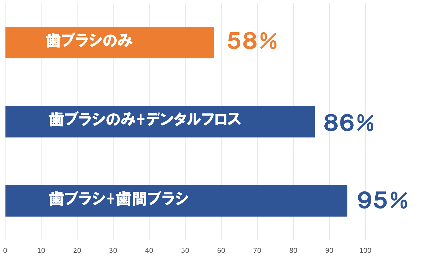 口内には歯ブラシが届かない部分があり、どれほど丁寧に行っても歯磨きだけでは60%程度の汚れしか落とせないとされています。奥歯・歯と歯の間に加えて、前歯の裏側もセルフケアでは汚れを落としにくい場所です。しっかりブラッシングをしても残ってしまう40%の汚れを落とすためには、デンタルフロスや糸ようじ、歯間ブラシなどによる適切なケアが必要です。こうしたセルフケアによって、汚れの除去率を80~90%程度まで上げることが可能です。